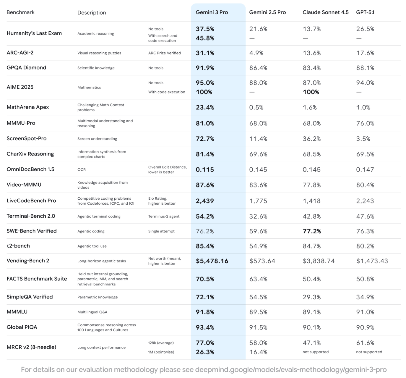 These evals shared by Google show how Gemini 3 Pro compares to other state-of-the-art models.