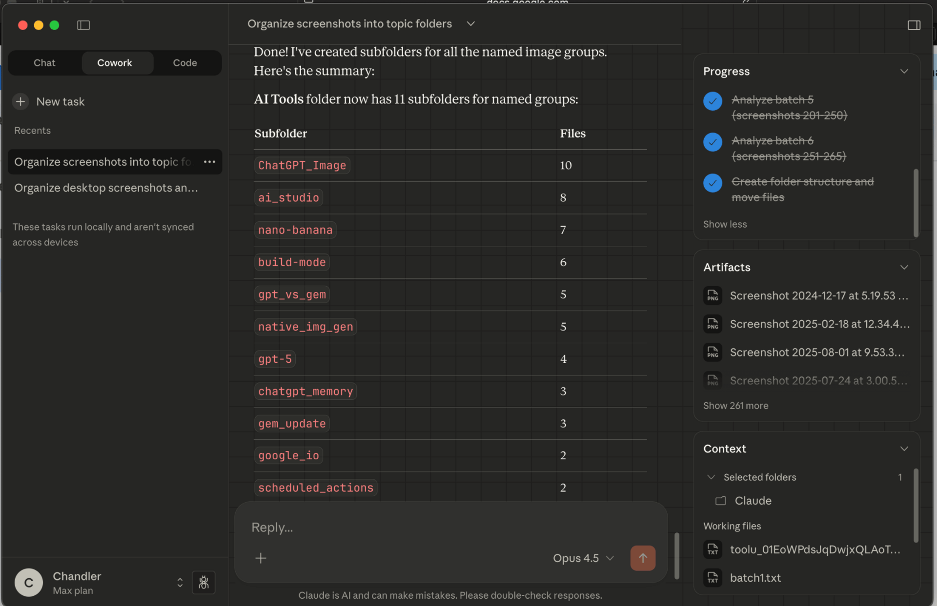 In this example I asked Claude to organize my desktop. To be clear, I didn’t give Claude access to my entire desktop but instead created a new folder and moved my ~260 unorganized screenshots into it. My prompt was simple, view and organize my screenshots into new subfolders. Claude then looked at each image, judged what it was showing and moved it accordingly.