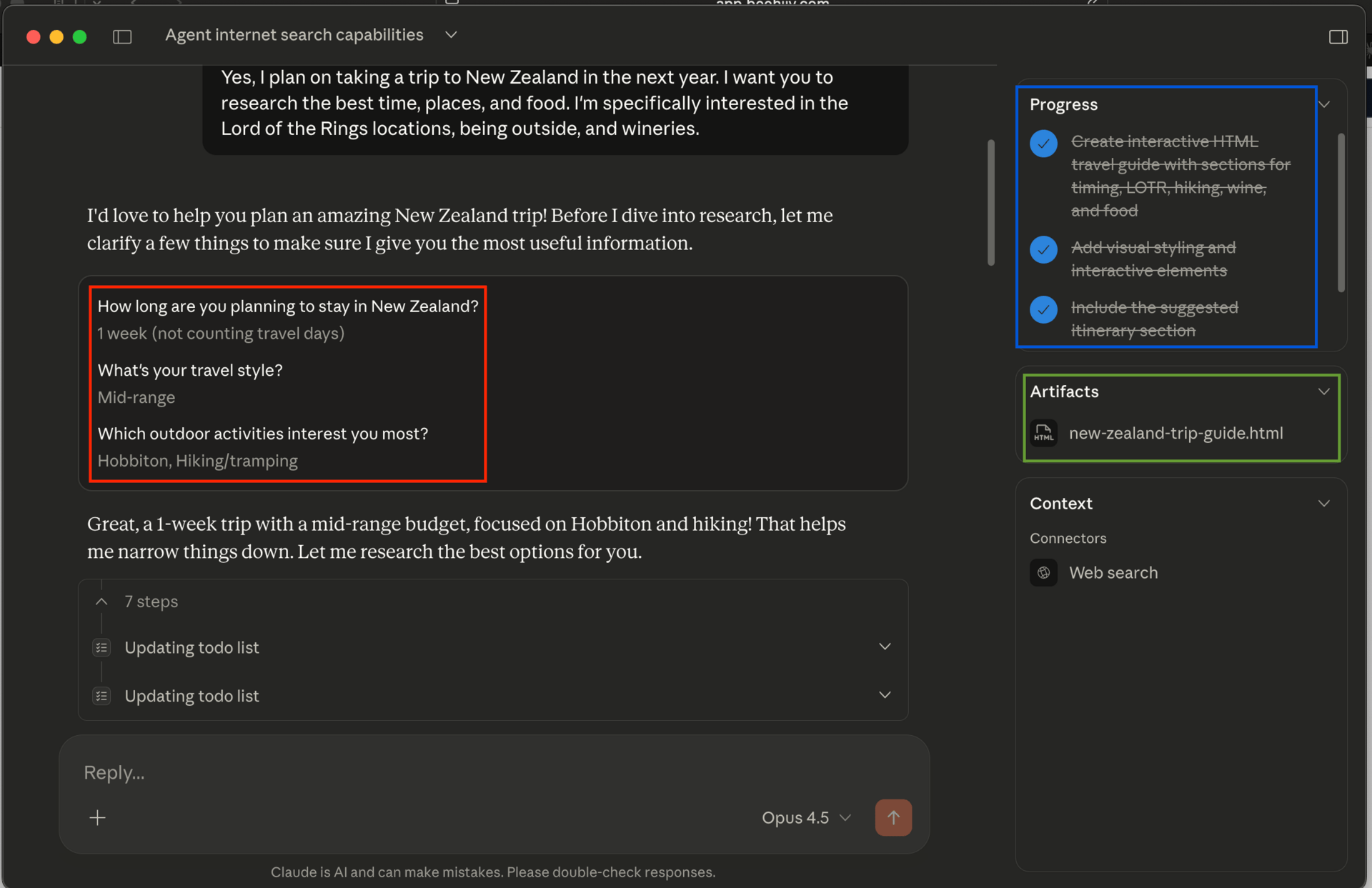 Red: Follow-up questions that Claude asked me. Blue: Current task progress. Green: Any new or changed files resulting from the tasks.