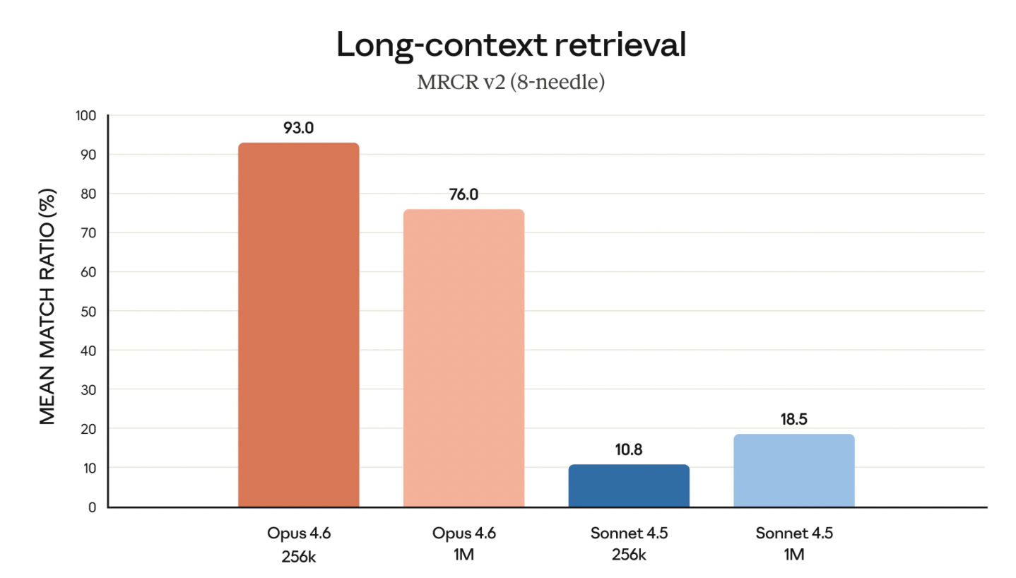 Opus 4.6 performs markedly better than its predecessors: on the 8-needle 1M variant of MRCR v2—a needle-in-a-haystack benchmark that tests a model’s ability to retrieve information “hidden” in vast amounts of text—Opus 4.6 scores 76%, whereas Sonnet 4.5 scores just 18.5%